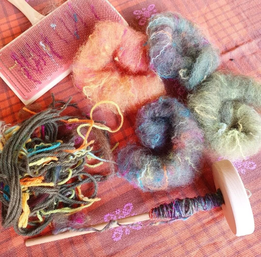 I had to invest in a pair of hand carders and a drop spindle. The yarn scraps are untwisted, blended together, then spun into new yarn.