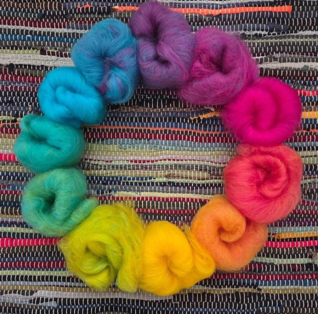 This was a simple crochet design using my own chunky handspun wool. I created a rainbow yarn using just three colours of fibre, blending the colours together in various quantities to achieve the range of colours in a colour wheel. (You can blend wool colours just like paint!)
