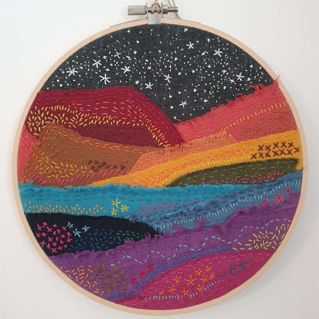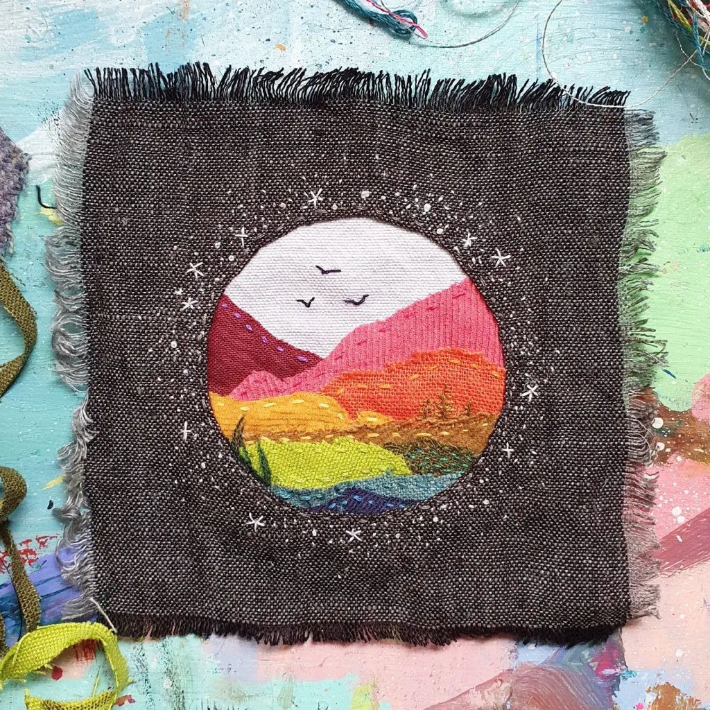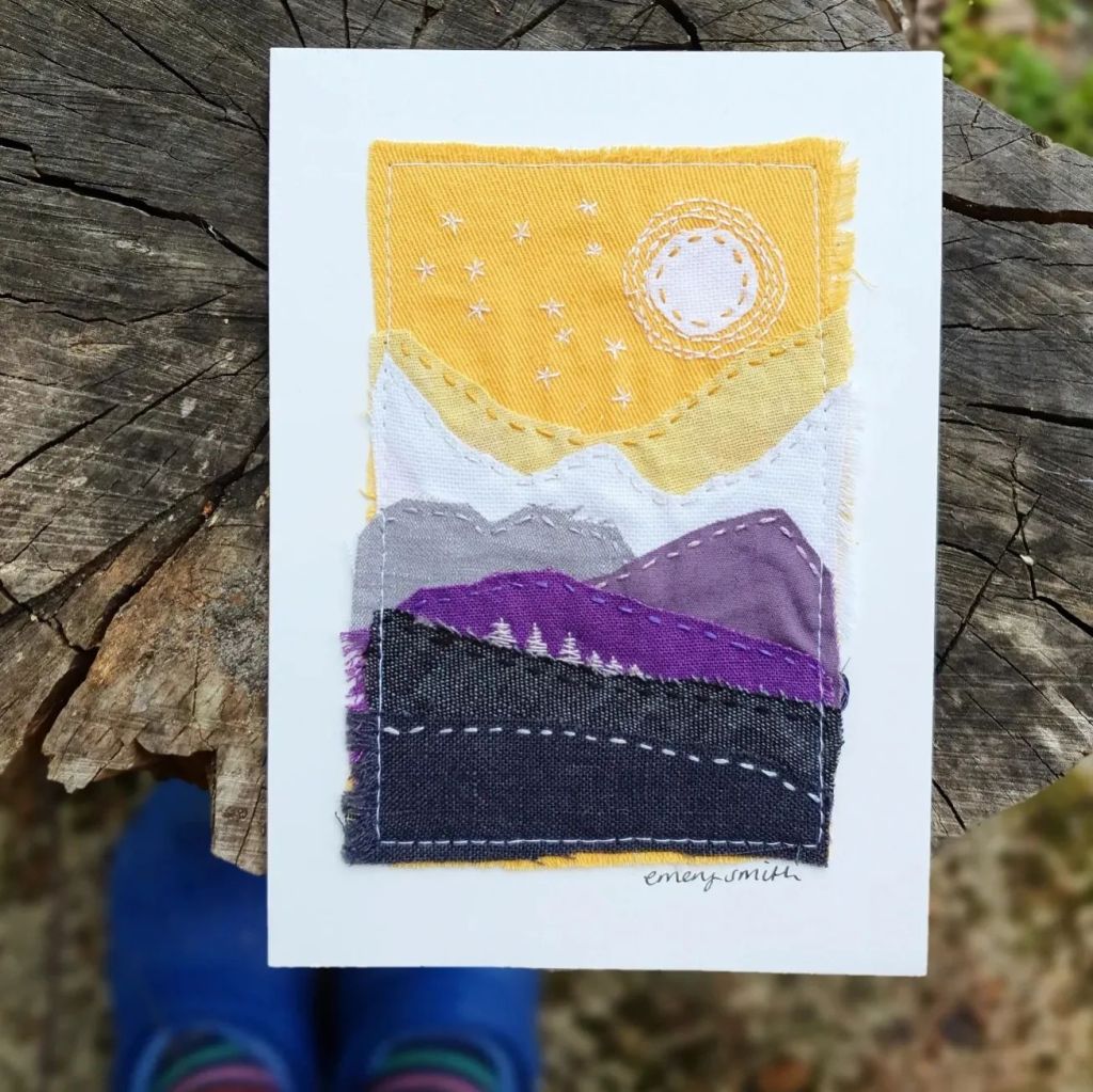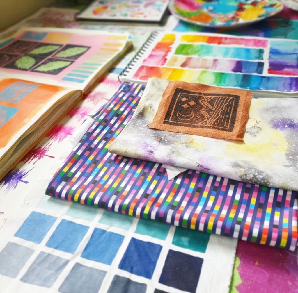 Tools – watercolourTake flight – fabric and embroidery threadBlue moon – watercolour on homemade paperBlock printing in my sketchbookPride Peaks – design for Kula ClothTwinkle Tents – design for Kula ClothIn the night garden – fabric, embroidery threadShattered – collage and watercolourRainbows & Clouds – design for TotsbotsShirt design for Gender Free WorldHit the hut – design for TotsBotsWeaving made using recycled tshirts